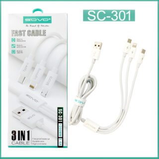 Crafted from environmentally friendly TPE material, this cable provides a comfortable and flexible user experience while maintaining robust tensile strength. Whether you’re charging your device or transferring data, the SOVO SC-301 cable delivers reliable performance, making it an essential accessory for modern tech users.What’s in the box: 1 x 3-in-1 Cable